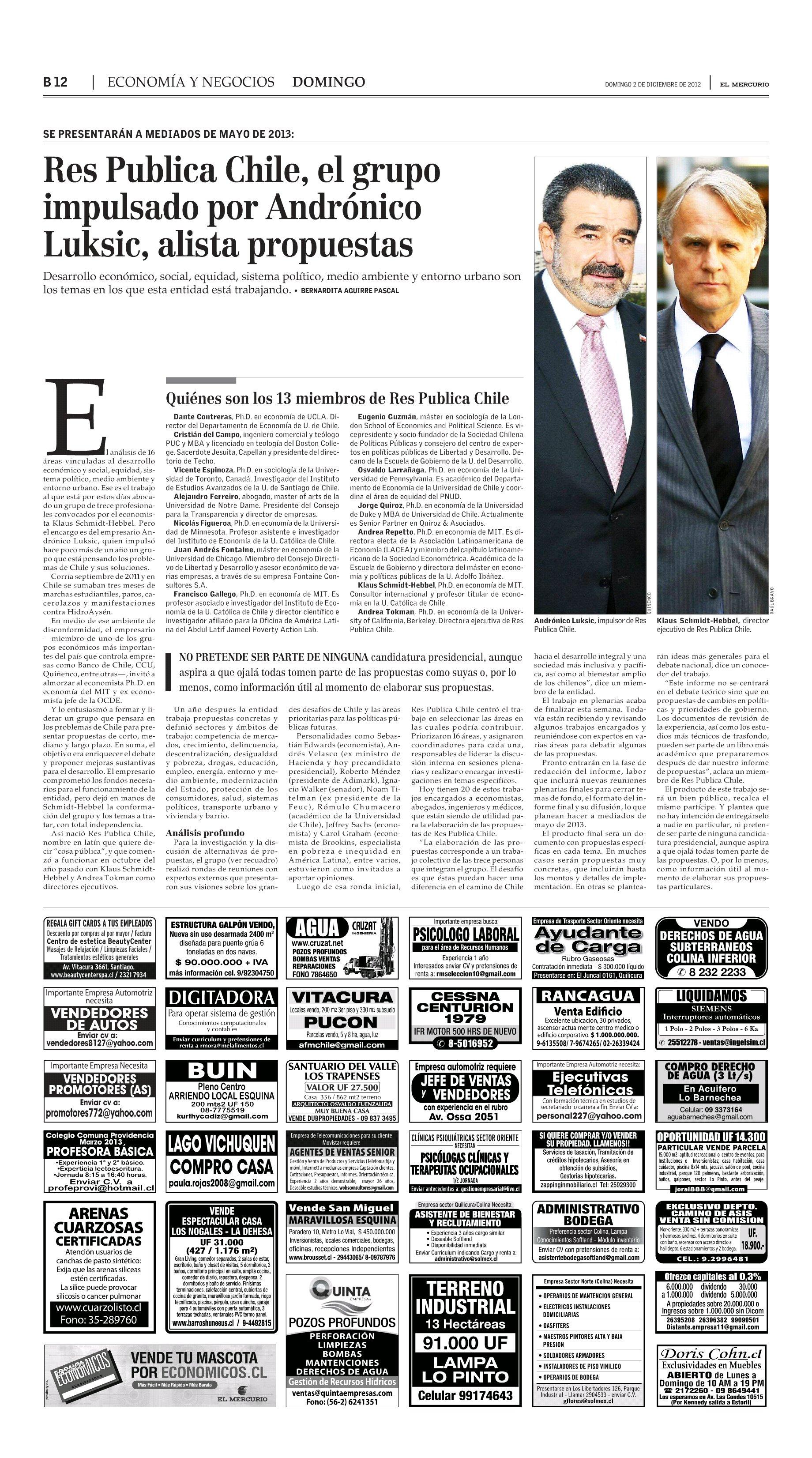 Res Publica Chile alista propuestas. El Mercurio 02 | 12 | 2012 Desarrollo económico, social, equidad, sistema político, medio ambiente y entorno urbano son los temas en los que esta entidad está trabajando. Compartir en: