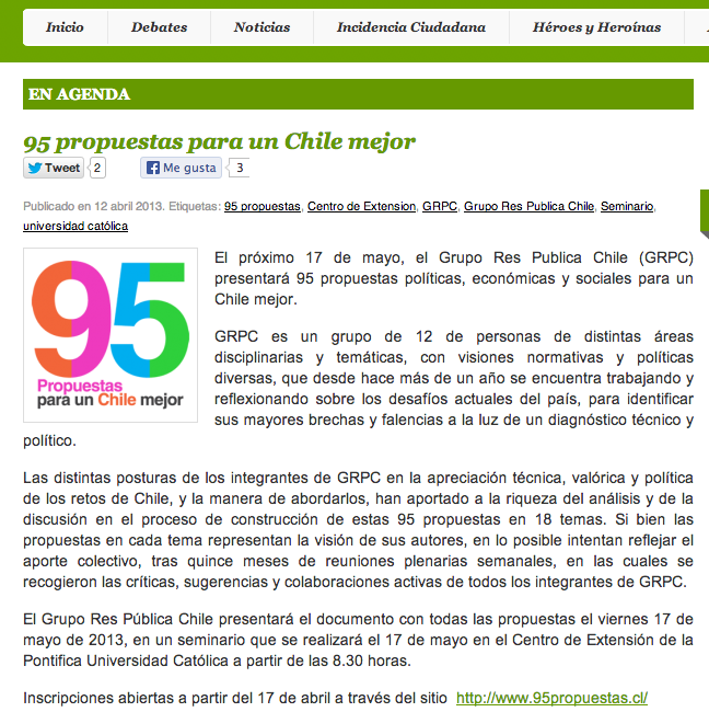 English Version 95 Proposals Executive Summary About us Presentation at IMF October 2013 Inicio Quiénes somos Integrantes de GRPC Invitados y colaboradores Staff 95 Propuestas Libro Las 95 propuestas Resumen ejecutivo Quiénes somos y cómo trabajamos Introducción Capítulos Biblioteca Presentaciones y documentos de invitados Estudios de trasfondo Presentaciones Seminario Seminarios Seminarios / Actividades Sala de Prensa GRPC en los medios Opinión Galería de Fotos 95 Propuestas para un Chile mejor Inicio Quiénes somos Integrantes de GRPC Invitados y colaboradores Staff 95 Propuestas Libro Las 95 propuestas Resumen ejecutivo Quiénes somos y cómo trabajamos Introducción Capítulos Biblioteca Presentaciones y documentos de invitados Estudios de trasfondo Presentaciones Seminario Seminarios Seminarios / Actividades Sala de Prensa GRPC en los medios Opinión Galería de Fotos English Version 95 Proposals Executive Summary About us Presentation at IMF October 2013 95 Propuestas para un Chile mejor Sala de Prensa GRPC en los medios 26 | 12 | 2013 Economistas entregan propuestas para mejorar el sistema político 25 | 12 | 2013 Para un Chile mejor 25 | 12 | 2013 Klaus Schmidt-Hebbel explicó las conclusiones del libro “95 propuestas para un Chile mejor” 24 | 12 | 2013 Un buen regalo para todo el país Sala de Prensa > GRPC en los medios > 95 propuestas para un Chile mejor 95 propuestas para un Chile mejor Acuerdos 12 | 04 | 2013 El próximo 17 de mayo, el Grupo Res Publica Chile (GRPC) presentará 95 propuestas políticas, económicas y sociales para un Chile mejor. Compartir en: