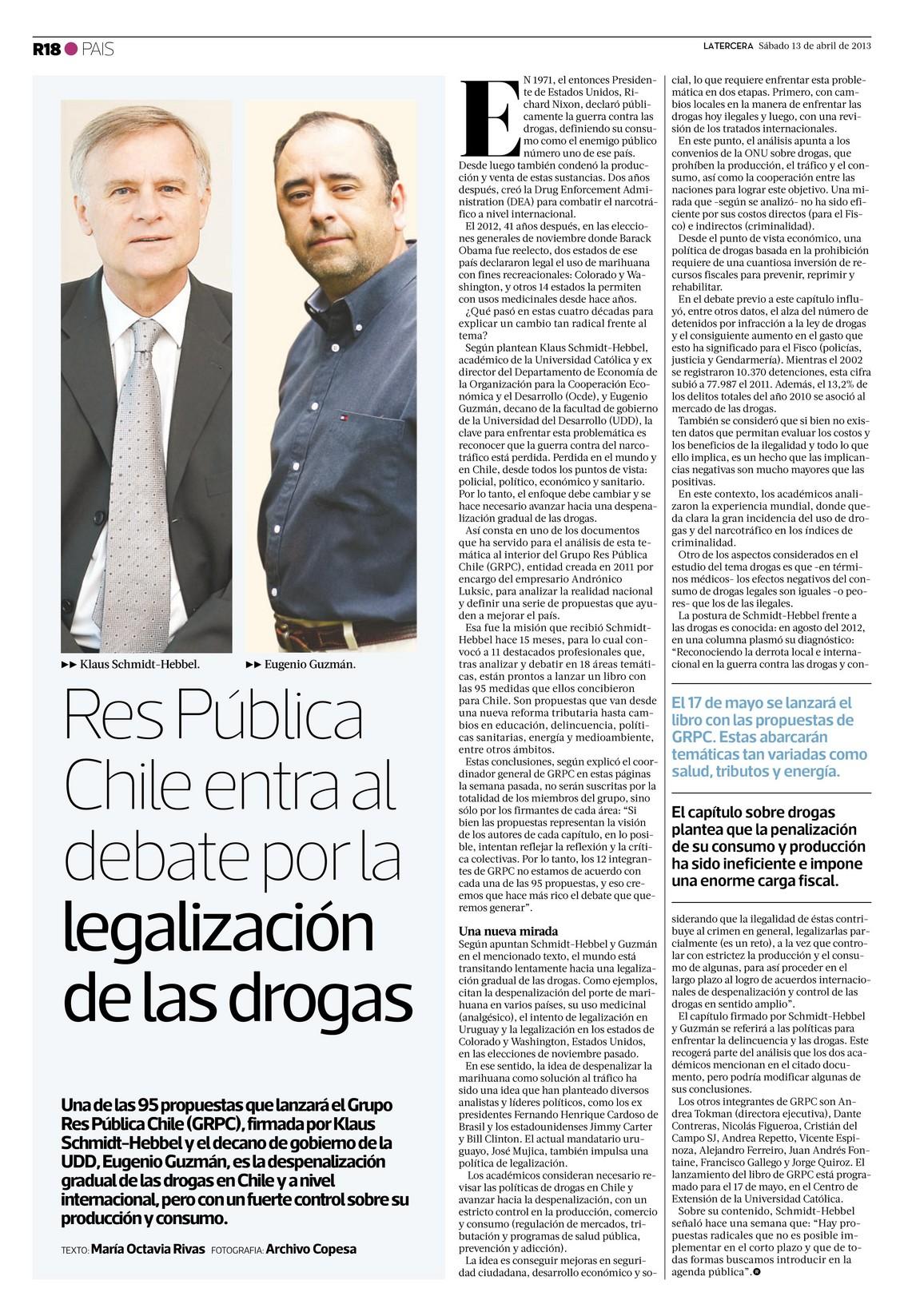 Una de las 95 propuestas que lanzará el Grupo Res Pública Chile (GRPC), firmada por Klaus Schmidt-Hebbel y el decano de gobierno de la UDD, Eugenio Guzmán, es la despenalización gradual de las drogas en Chile y a nivel internacional, pero con un fuerte control sobre su producción y consumo.
