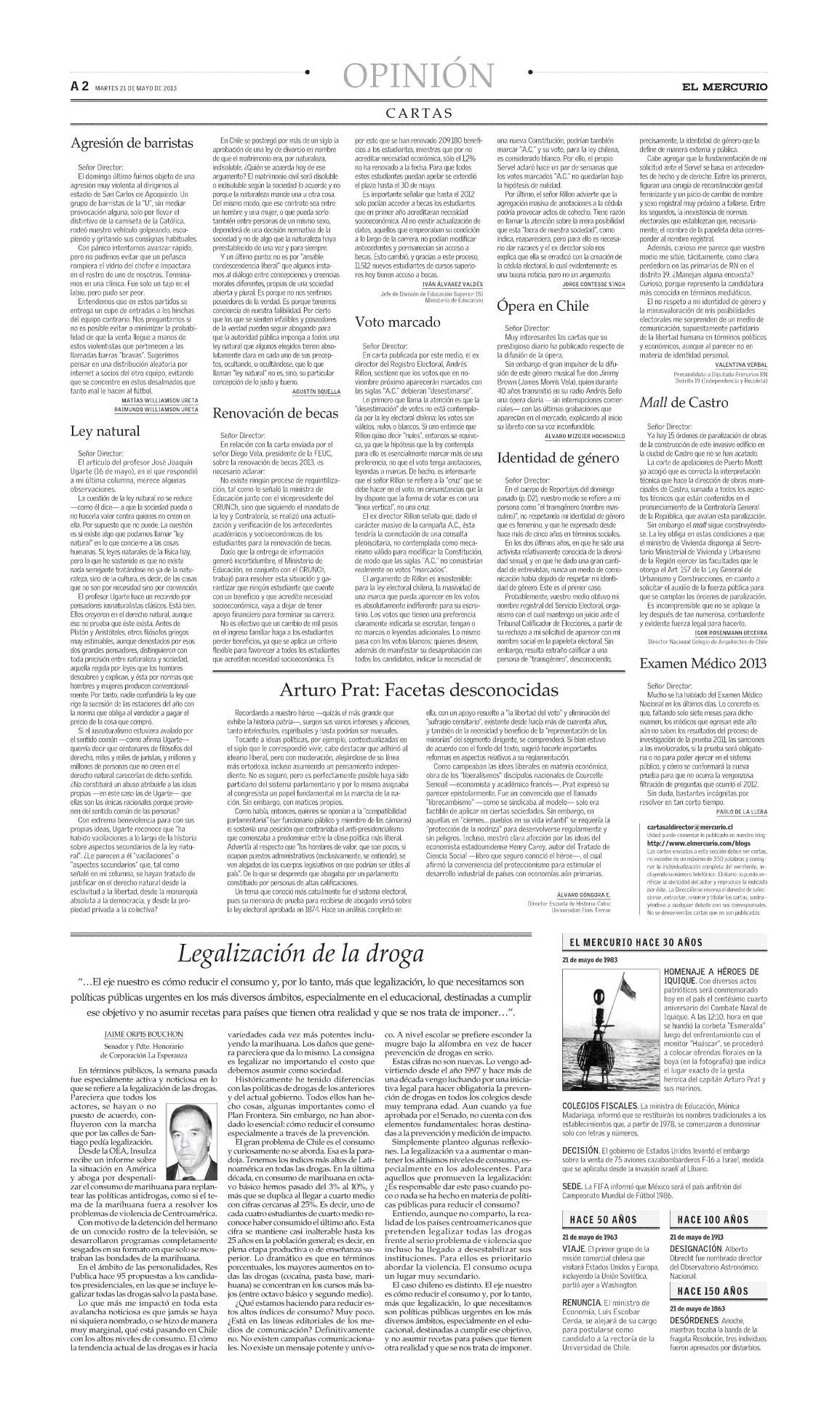 Columna de Jaime Orpis. Legalización de las drogas El Mercurio 21 | 05 | 2013 “…En el ámbito de las personalidades, Res Publica hace 95 propuestas a los candidatos presidenciales, en las que se incluye legalizar todas las drogas salvo la pasta base” Compartir en: