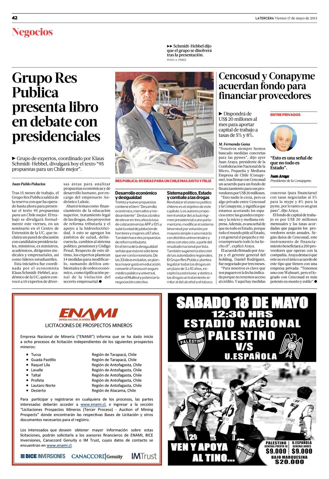 Tras 15 meses de trabajo, el Grupo Res Publica saldrá de la reserva con que ha operado hasta ahora para presentar el texto 95 propuestas para un Chile mejor. El trabajo se divulgará formalmente este viernes, en un seminario en el Centro de Extensión de la UC, que incluirá un panel de discusión con candidatos presidenciales, ministros, ex ministros, académicos, dirigentes sindicales y empresariales, así como líderes estudiantiles.