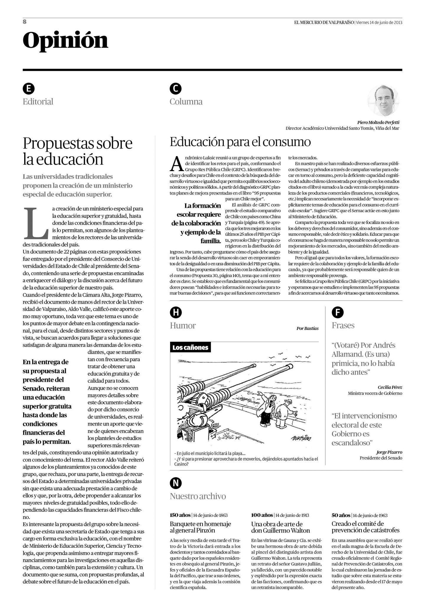 Educación para el consumo El Mercurio de Valparaíso 14 | 06 | 2013 Columna de Piero Moltedo Perfetti, Director Académico Universidad Santo Tomás, Viña del Mar. El docente menciona las propuestas de GRPC. Compartir en: