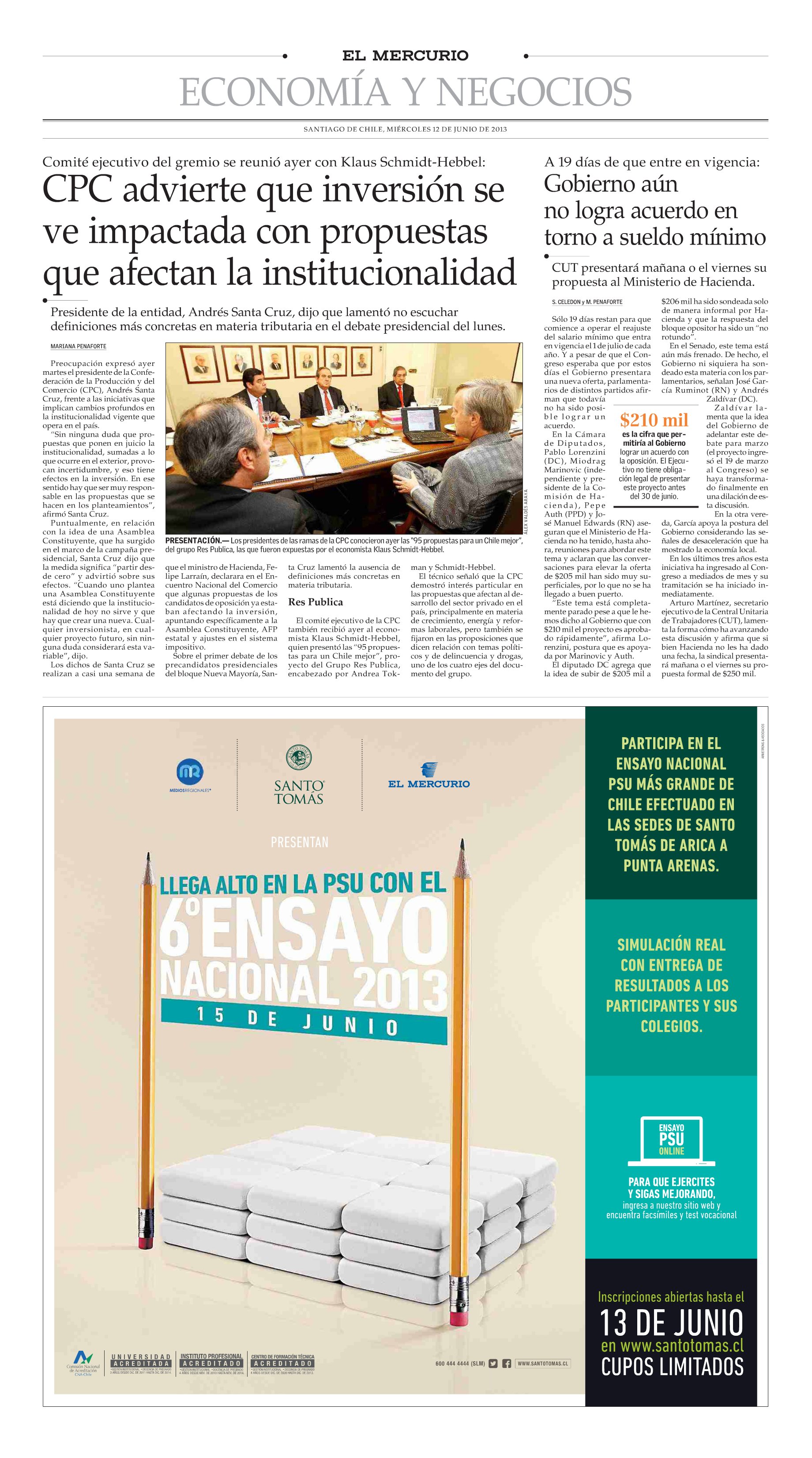 English Version 95 Proposals Executive Summary About us Presentation at IMF October 2013 Inicio Quiénes somos Integrantes de GRPC Invitados y colaboradores Staff 95 Propuestas Libro Las 95 propuestas Resumen ejecutivo Quiénes somos y cómo trabajamos Introducción Capítulos Biblioteca Presentaciones y documentos de invitados Estudios de trasfondo Presentaciones Seminario Seminarios Seminarios / Actividades Sala de Prensa GRPC en los medios Opinión Galería de Fotos 95 Propuestas para un Chile mejor Inicio Quiénes somos Integrantes de GRPC Invitados y colaboradores Staff 95 Propuestas Libro Las 95 propuestas Resumen ejecutivo Quiénes somos y cómo trabajamos Introducción Capítulos Biblioteca Presentaciones y documentos de invitados Estudios de trasfondo Presentaciones Seminario Seminarios Seminarios / Actividades Sala de Prensa GRPC en los medios Opinión Galería de Fotos English Version 95 Proposals Executive Summary About us Presentation at IMF October 2013 95 Propuestas para un Chile mejor Sala de Prensa GRPC en los medios 26 | 12 | 2013 Economistas entregan propuestas para mejorar el sistema político 25 | 12 | 2013 Para un Chile mejor 25 | 12 | 2013 Klaus Schmidt-Hebbel explicó las conclusiones del libro “95 propuestas para un Chile mejor” 24 | 12 | 2013 Un buen regalo para todo el país Sala de Prensa > GRPC en los medios > GRPC presenta sus propuestas con la Confederación de la Producción y el Comercio GRPC presenta sus propuestas con la Confederación de la Producción y el Comercio El Mercurio 12 | 06 | 2013 En el encuentro se analizaron las propuestas en materia laboral, tributaria y ambiental. Compartir en: