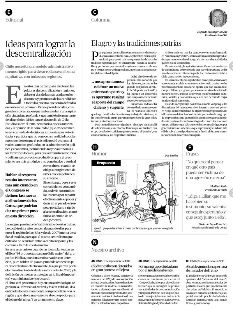 En este escenario es cuando las ideas planteadas en el libro “95 propuestas para un Chile mejor” del grupo Res Pública, pueden ser observadas con detención, pues hablan de plazos y medidas concretas para descentralizar efectivamente, las que parten por la elección directa de todas las autoridades (el 2016) y la definición de nuevas estrategias en lo fiscal (impuestos) y administrativo (estructura).