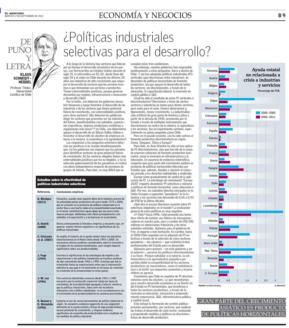 ¿Y Chile? Hacia 1996, Intel presentó una tentadora oferta de instalar una fábrica de microprocesadores en nuestro país, pero a cambio de US$ 200 millones en deducciones tributarias y de otros subsidios estatales. Aplausos para el gobierno de Frei, al negarse a esta tentación. En cambio, hacia el 2008 Chile coqueteó con la adopción de PI selectivas a través de la selección de cinco sectores ganadores -los clusters – que recibirían tratos preferenciales del Estado para su desarrollo.