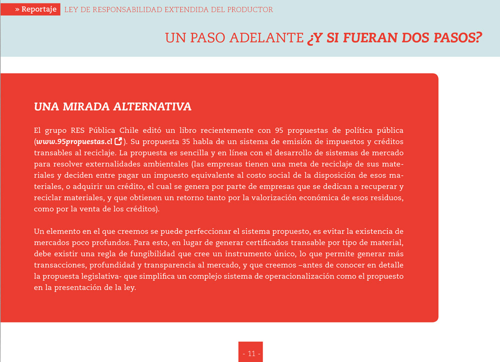 El reportaje sobre Ley de Responsabilidad Extendida del Productor, de la revista The Note (www.thenote.cl), hace referencia a una de las 95 Propuestas para un Chile Mejor.