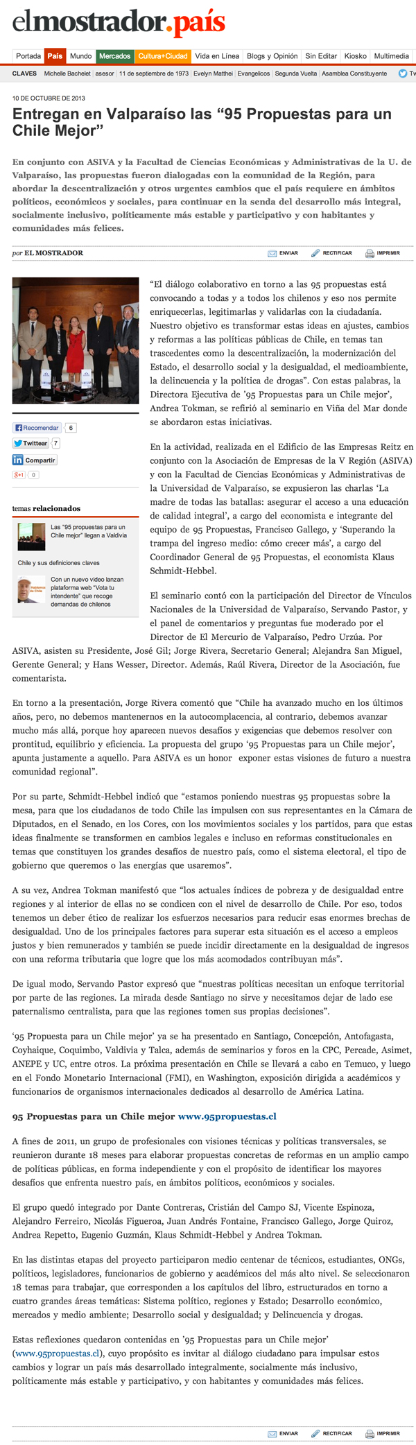 En conjunto con ASIVA y la Facultad de Ciencias Económicas y Administrativas de la U. de Valparaíso, las propuestas fueron dialogadas con la comunidad de la Región, para abordar la descentralización y otros urgentes cambios que el país requiere en ámbitos políticos, económicos y sociales, para continuar en la senda del desarrollo más integral, socialmente inclusivo, políticamente más estable y participativo y con habitantes y comunidades más felices.