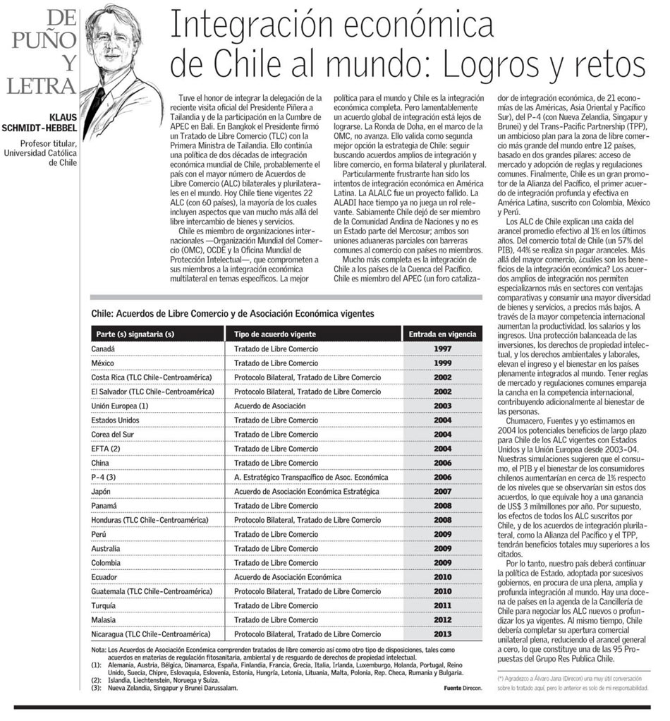 Tuve el honor de integrar la delegación de la reciente visita oficial del Presidente Piñera a Tailandia y de la participación en la Cumbre de la APEC en Bali. En Bangkok el Presidente firmó un Tratado de Libre Comercio (TLC) con la Primera Ministra de Tailandia. Ello continúa una política de dos decadas de integración económica mundial de Chile, probablemente el país con mayor número de Acuerdos de Libre Comercio (ALC) bilaterales y plurilaterales del mundo.