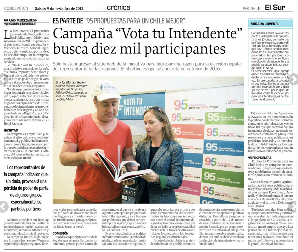 La idea madre: 95 Propuestas para un Chile mejor, del Grupo Res Publica Chile, cuyo objetivo tras su formación en 2011, es pensar en el país identificando sus desafíos y falencias. El rostro: Marcial Tagle, actor, quien cautivado por la idea, ha decidido impulsar su campaña poniendo su voz y popularidad a su servicio.