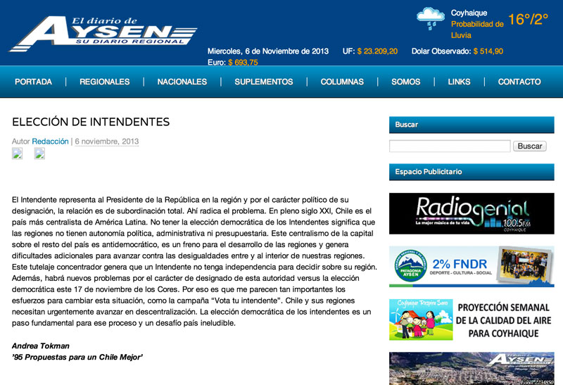 El Intendente representa al Presidente de la República en la región y por el carácter político de su designación, la relación es de subordinación total. Ahí radica el problema. En pleno siglo XXI, Chile es el país más centralista de América Latina. No tener la elección democrática de los Intendentes significa que las regiones no tienen autonomía política, administrativa ni presupuestaria. Este centralismo de la capital sobre el resto del país es antidemocrático, es un freno para el desarrollo de las regiones y genera dificultades adicionales para avanzar contra las desigualdades entre y al interior de nuestras regiones. Este tutelaje concentrador genera que un Intendente no tenga independencia para decidir sobre su región. Además, habrá nuevos problemas por el carácter de designado de esta autoridad versus la elección democrática este 17 de noviembre de los Cores. Por eso es que me parecen tan importantes los esfuerzos para cambiar esta situación, como la campaña “Vota tu intendente”. Chile y sus regiones necesitan urgentemente avanzar en descentralización. La elección democrática de los intendentes es un paso fundamental para ese proceso y un desafío país ineludible.