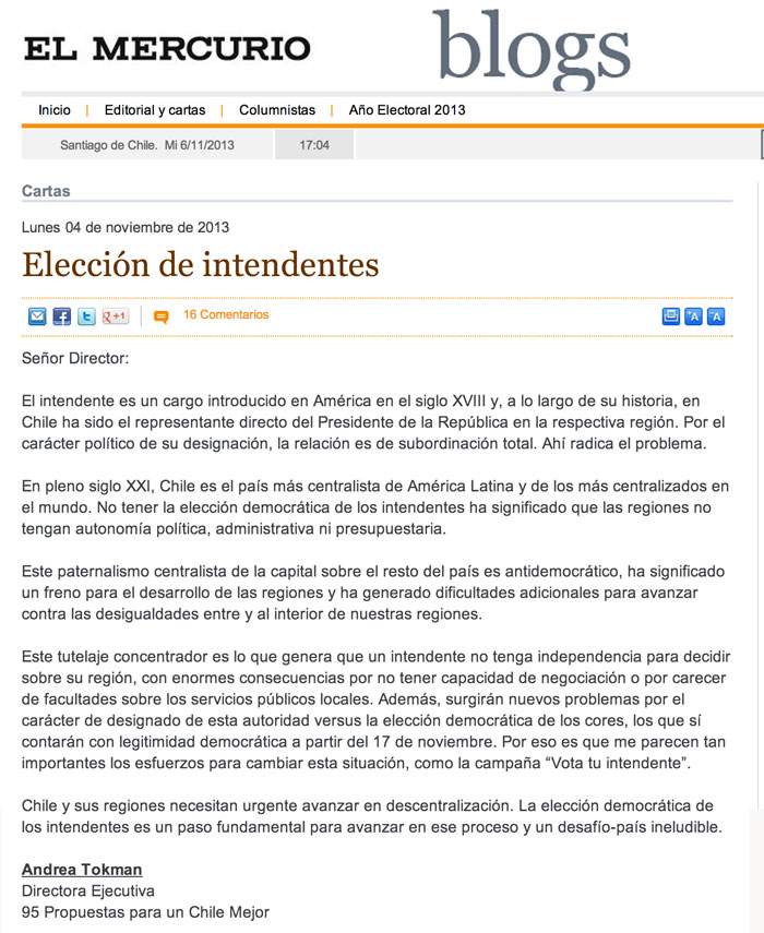 En pleno siglo XXI, Chile es el país más centralista de América Latina y de los más centralizados en el mundo. No tener la elección democrática de los intendentes ha significado que las regiones no tengan autonomía política, administrativa ni presupuestaria.