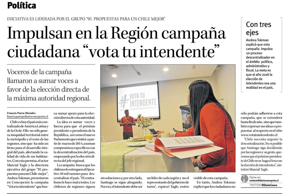Chile es hoy el país más centralizado de América Latina y de la Ocde. Ello no sólo genera inequidad territorial entre la metrópolis y el resto de las regiones, sino que ha sido un freno para el desarrollo integral del país, afectando la calidad de vida de sus habitantes. Con esta premisa, el actor Marcial Tagle y la directora ejecutiva del grupo “95 Propuestas para un Chile mejor”, Andrea Tokman, presentaron en Concepción la campaña “Vota tu Intendente” que busca sumar apoyo para la elección directa de esta autoridad.