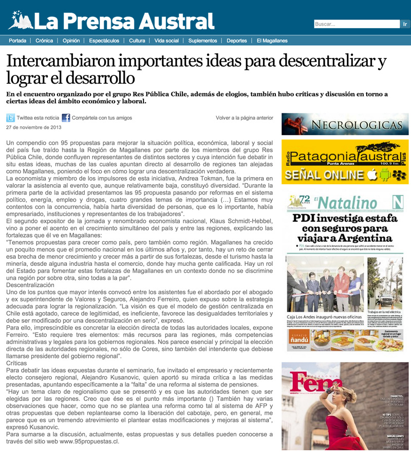 Un compendio con 95 propuestas para mejorar la situación política, económica, laboral y social del país fue traído hasta la Región de Magallanes por parte de los miembros del grupo Res Pública Chile, donde confluyen representantes de distintos sectores y cuya intención fue debatir in situ estas ideas, muchas de las cuales apuntan directo al desarrollo de regiones tan alejadas como Magallanes, poniendo el foco en cómo lograr una descentralización verdadera.