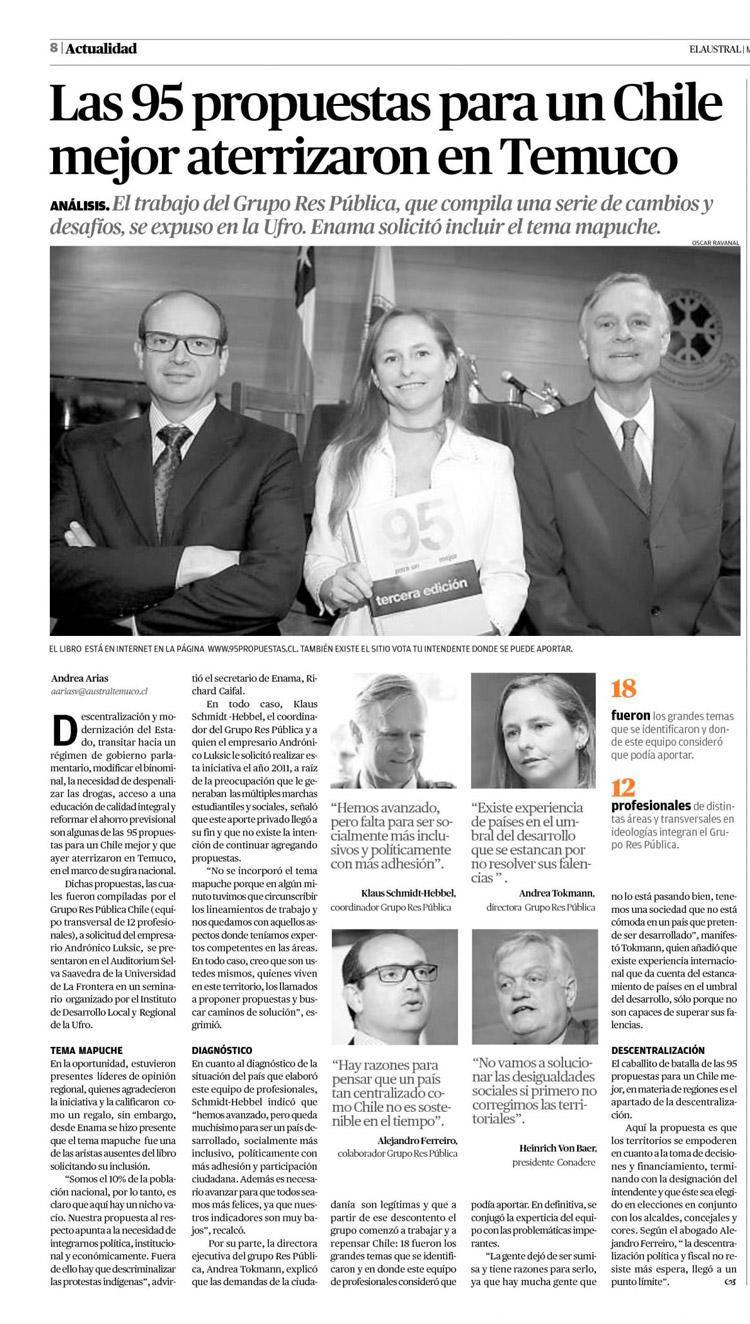 Dichas propuestas, las cuales fueron compiladas por el Grupo Res Publica Chile (equipo transversal de 12 profesionales), a solicitud del empresario Andrónico Luksic, se presentaron en el Auditorium Selva Saavedra de la Universidad de La Frontera en un seminario organizado por el Instituto de Desarrollo Local y Regional de la Ufro.