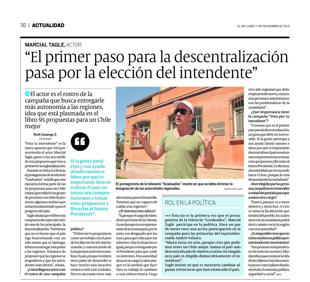 El actor es el rostro de la campaña que busca entregarle más autonomía a las regiones, idea que está plasmada en el libro “95 Propuestas para un Chile mejor”.