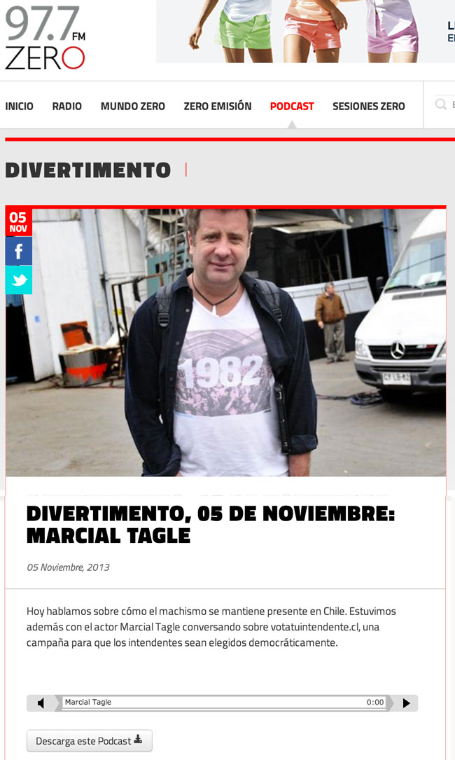 Radio Zero Divertimento: Marcial Tagle Radio Zero 06 | 11 | 2013 Hoy hablamos sobre cómo el machismo se mantiene presente en Chile. Estuvimos además con el actor Marcial Tagle conversando sobre votatuintendente.cl, una campaña para que los intendentes sean elegidos democráticamente. Compartir en: