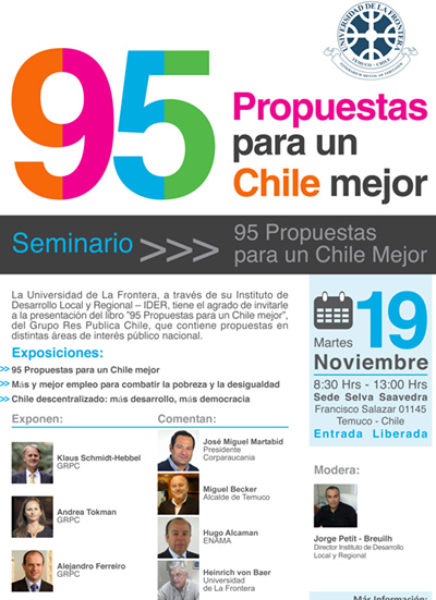 Sala de Prensa > Novedades > Seminario IDER-UFRO: Este 19 de noviembre se presentará en la ciudad de Temuco el libro “95 Propuestas para un Chile mejor”. Para más información pinche aquí