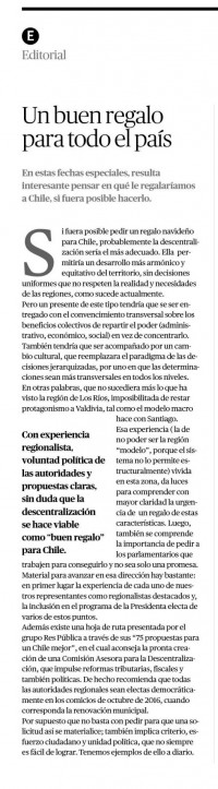 Si fuera posible pedir un regalo navideño para Chile, probablemente la descentralización sería el más adecuado. Ella permitiría un desarrollo más armónico y equitativo del territorio, sin decisiones uniformes que no respeten la realidad y necesidades de las regiones, como sucede actualmente.