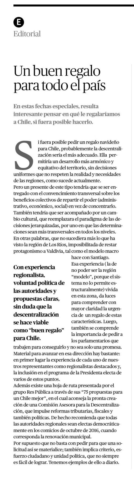 Si fuera posible pedir un regalo navideño para Chile, probablemente la descentralización sería el más adecuado. Ella permitiría un desarrollo más armónico y equitativo del territorio, sin decisiones uniformes que no respeten la realidad y necesidades de las regiones, como sucede actualmente.